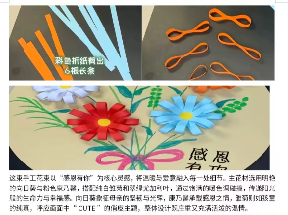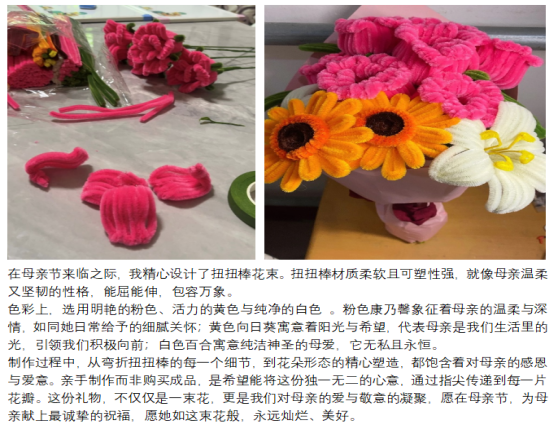 此次活动以线上的形式开展。各班班委积极动员,同学们踊跃响应,充分发挥创意,精心准备了形式多样的母亲节主题手工作品,工艺品、贺卡、绘画等饱含着对母亲的深厚感情。同学们不仅用心制作,还详细记录了从准备材料工具到完成作品的全过程,写下设计理念及对母亲的祝福语。
